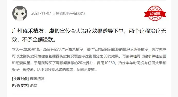 在品牌信誉方面,消费者不断投诉也进一步损害了其市场公信力。黑猫投诉等公开平台上有用户反映,在广州雍禾植发接受服务时遭遇了虚假宣传和夸大疗效的问题,被诱导下单后经历了两个疗程的治疗仍未达到承诺的效果,并且之后也没有得到全额退款。