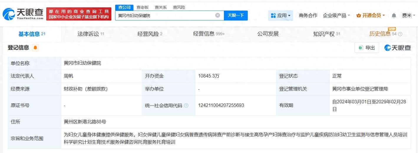 天眼查工商信息显示,涉事医院黄冈市妇幼保健院法定代表人为周帆,宗旨和业务范围包括妇女保健、儿童保健、妇女病普查等。变更记录显示,去年1月,该医院开办资金由约1.4亿人民币减至约1.1亿人民币。天眼风险信息显示,近期,该医院因医学影像科1名医师不符合资质条件开展产前筛查,被黄冈市卫生健康委员会罚款2.5万元。此外,该医院多次因医疗损害责任纠纷被起诉。