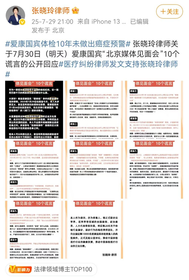 今日,爱康国宾就此前引发热议的“女律师张女士十年体检未查出癌症”一事召开媒体说明会。公开回应称:“张女士造谣令员工深受伤害,已向法院提起诉讼,法院已正式立案受理。”