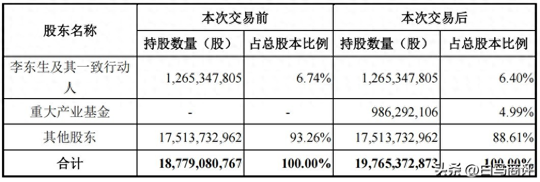 若交易顺利完成,李东生及其一致行动人在TCL科技中的持股比例将从目前的6.74%下降至6.4%,重大产业基金则以4.99%的持股比例成为TCL科技的第二大股东。