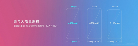 高达4000mAh的大电池,容量相比上一代提升约17.5%,让荣耀20青春版的续航得到充分保障,配合AI智慧节电技术,荣耀20青春版能够实现通话40小时,在线追剧16.7小时,听音乐100小时,待机时间20.8天的超长续航。此外,荣耀20青春版标配20W快充,30分钟即可充电到53%。荣耀20青春版还保留了3.5mm耳机接孔,带来更便捷的视听体验。