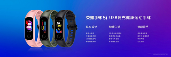 荣耀手环5i也正式亮相。荣耀手环5i加入了便捷的USB即插即充设计,拆下表带即可插入USB口充电。同时,该产品还保留了荣耀手环5特有的血氧检测功能,并支持智能心率监测、科学睡眠监测、9项运动模式、移动支付等,配色方面提供陨石黑、珊瑚粉、橄榄绿三色可选,售价159元。