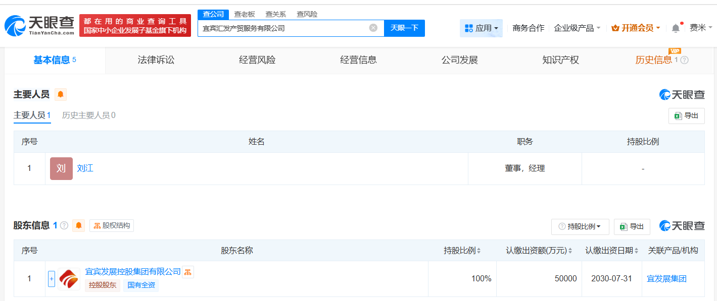 天眼查工商信息显示,近日,宜宾汇发产贸服务有限公司成立,法定代表人为刘江,注册资本5亿人民币,经营范围包括供应链管理服务、采购代理服务、销售代理、电池销售、金属矿石销售、金属材料销售等。股东信息显示,该公司由宜宾发展控股集团有限公司全资持股。