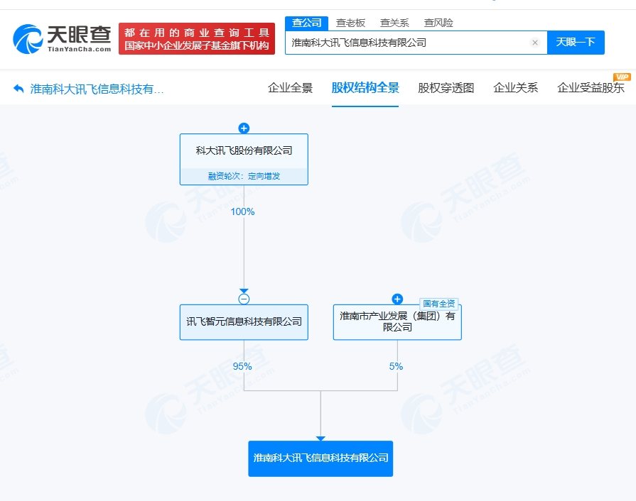 淮南科大讯飞信息科技有限公司成立于2014年12月,法定代表人为张友国,注册资本1000万人民币,经营范围包括智慧城市技术研究、体系建设、产品研发、工程建设、运营服务等。股权全景穿透图显示,该公司由科大讯飞旗下讯飞智元信息科技有限公司、淮南市产业发展(集团)有限公司共同持股。