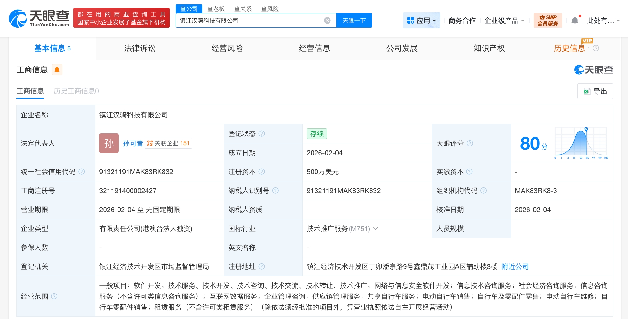 天眼查App显示,近日,镇江汉骑科技有限公司成立,法定代表人为孙可青,注册资本500万美元,经营范围含软件开发、网络与信息安全软件开发、信息技术咨询服务、信息咨询服务、互联网数据服务、企业管理咨询、供应链管理服务、租赁服务等。