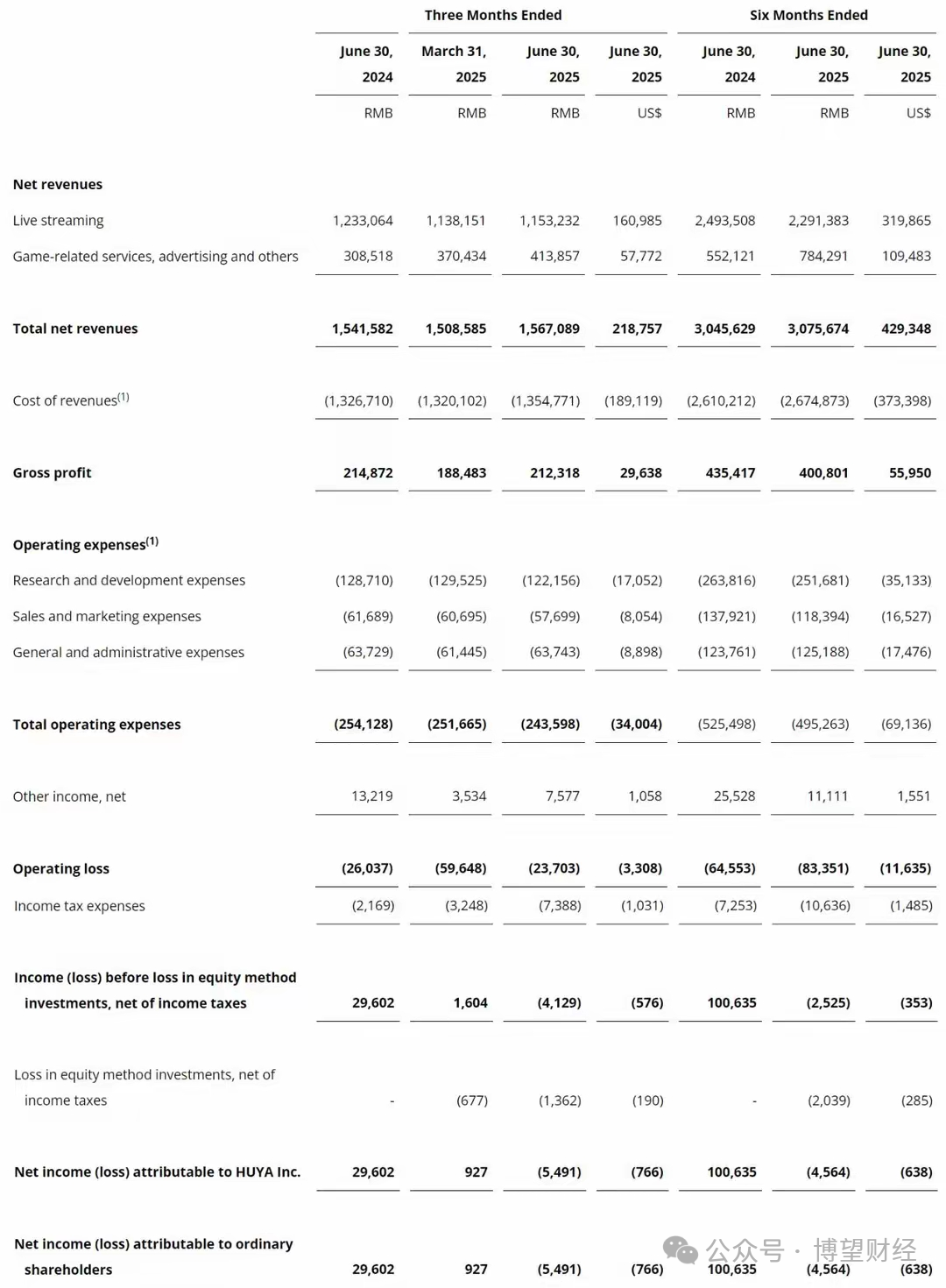 按照虎牙公司 (NYSE: HUYA)公布截至2025年6月30日的2025年第二季度财报。财报显示,虎牙2025年上半年营收为30.76亿元(约4.29亿美元),上年同期的营收为30.46亿元,对比略有增长。虎牙2025年第二季度营收为15.67亿元(约2.19亿美元),较上年同期的15.42亿元增长2%,同样实现微增。