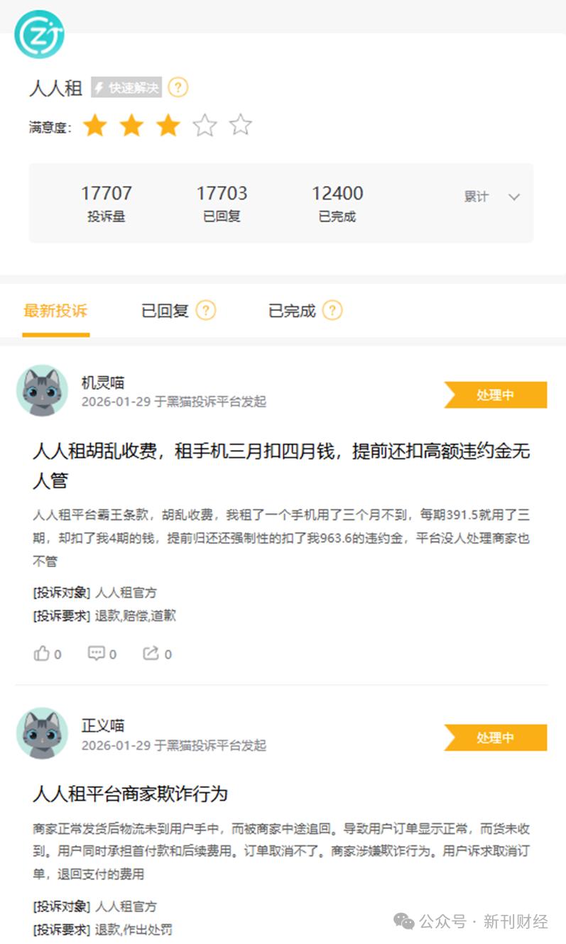 在黑猫投诉平台上,截至1月29日,针对人人租的投诉量已累积超过1.7万,而完成率仅70%。投诉内容高度集中在翻新机冒充新机、强制买断、霸王条款导致退租难以及暴力催收等。