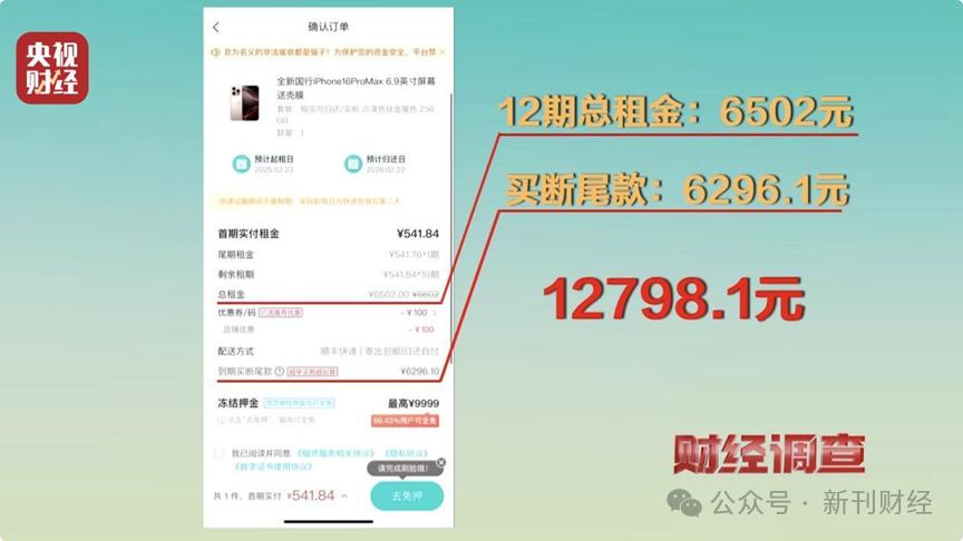 以央视曝光的人人租平台上的某iPhone手机为例:其市场零售价为9999元,租期12个月,月租金541.84元,12期总租金6502元,到期再付买断费6296.1元,消费者实际需要支付的金额至少是12798.1元,高出正常市场价近28%。经计算,如果消费者全部按时付款,相比于用9999元原价一次性买断,采用人人租交易方式的IRR(实际交易成本)约为36%,如果再叠加逾期费或滞纳金等,年化利率只会更高。