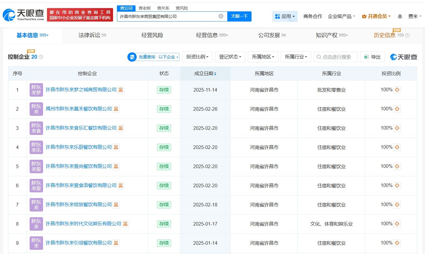 天眼查工商信息显示,胖东来关联企业许昌市胖东来商贸集团有限公司成立于1997年9月,法定代表人为于东来,注册资本5660万人民币,经营范围包括房地产开发销售、场地及柜台租赁、炒货食品分装等。股东信息显示,该公司由于东来、张春兰、于娟等共同持股。控制企业信息显示,该公司控制20家企业,去年,该公司成立了许昌市胖东来梦之城商贸有限公司、禹州市胖东来嘉禾餐饮有限公司、许昌市胖东来食乐汇餐饮有限公司等近十家新公司。