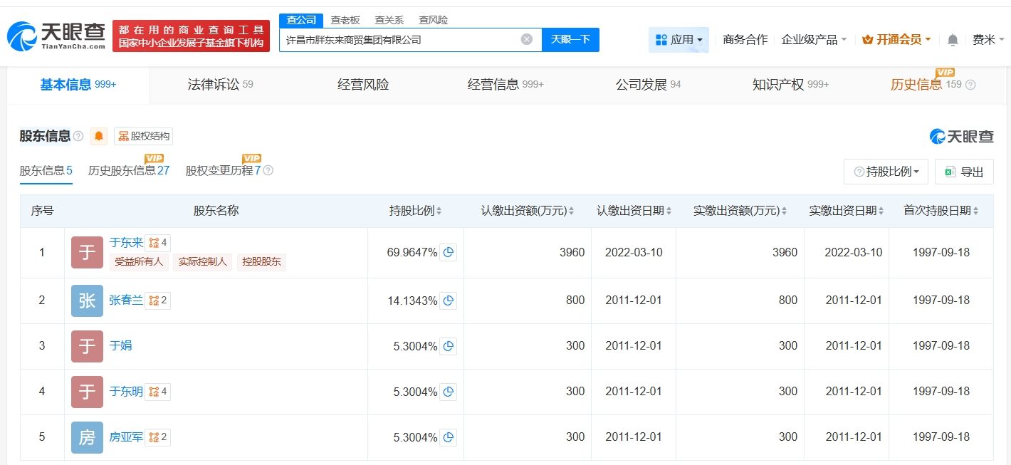 天眼查工商信息显示,胖东来关联企业许昌市胖东来商贸集团有限公司成立于1997年9月,法定代表人为于东来,注册资本5660万人民币,经营范围包括房地产开发销售、场地及柜台租赁、炒货食品分装等。股东信息显示,该公司由于东来、张春兰、于娟等共同持股。