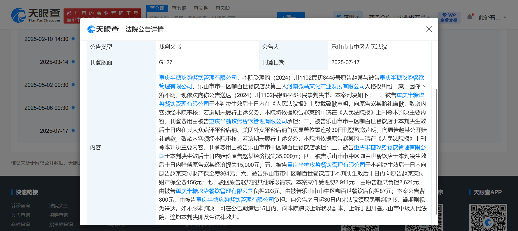 天眼查法律诉讼信息显示,近日,法院公告送达赵丽颖与重庆半糖攻势餐饮管理有限公司、乐山市市中区咖百世餐饮店及第三人河南微马文化产业发展有限公司人格权纠纷一案民事判决书。