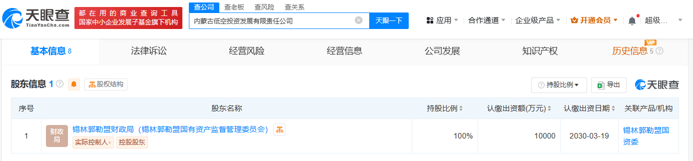 天眼查App显示,近日,内蒙古低空投资发展有限责任公司成立,法定代表人为李志国,注册资本1亿人民币,经营范围包括自有资金投资的资产管理服务、智能无人飞行器制造、智能无人飞行器销售、航空运营支持服务等。股东信息显示,该公司由锡林郭勒盟财政局(锡林郭勒盟国有资产监督管理委员会)全资持股。
