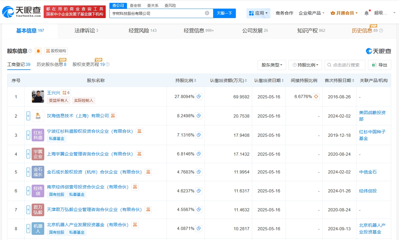 该公司成立于2016年8月,法定代表人为王兴兴,注册资本约3.64亿人民币,经营范围包括智能机器人的研发、智能机器人销售、工业机器人制造等。股东信息显示,该公司由王兴兴、汉海信息技术(上海)有限公司、宁波红杉科盛股权投资合伙企业(有限合伙)等共同持股。变更记录显示,今年5月,该公司名称由“杭州宇树科技有限公司”变更为“杭州宇树科技股份有限公司”。
