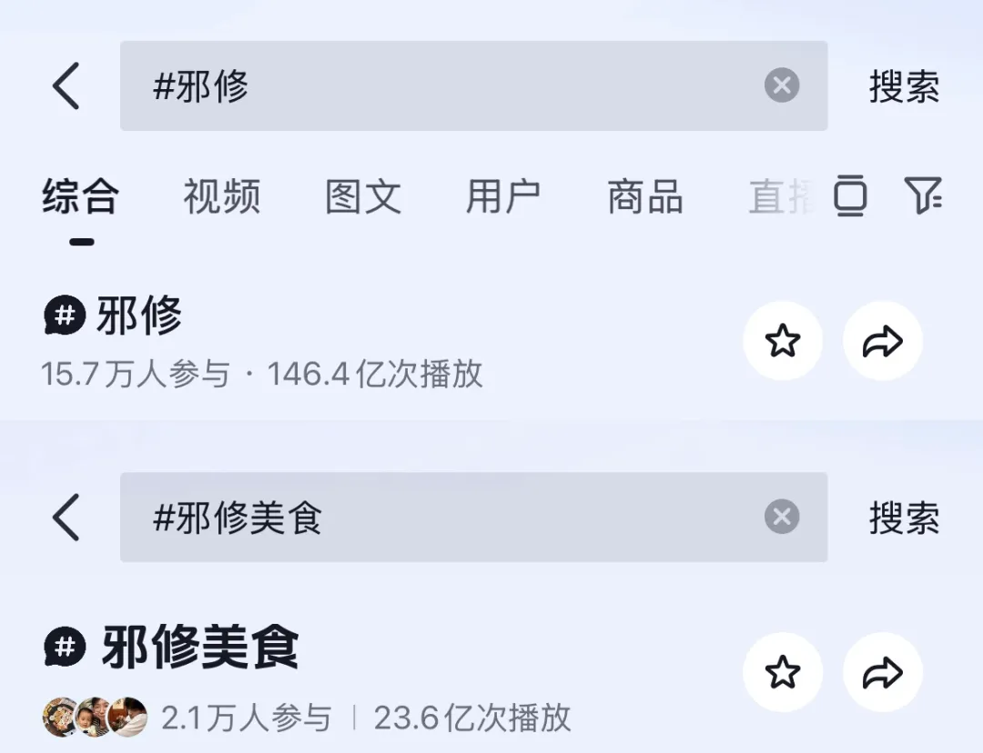 截至2026年4月中旬,抖音“#邪修” 的话题总播放量超146.4亿次,“#邪修美食” 的单话题播放量近24亿次,小红书相关话题讨论量达到431.5万+,总浏览量25.9亿+;B站与邪修相关二创视频播放量达到50亿+;话题覆盖人群以00后为主力,这一群体的占比高达95%;此外,邪修话题在90后群体中也有广泛参与,且已逐渐下沉至学生、职场人、宝妈等群体。