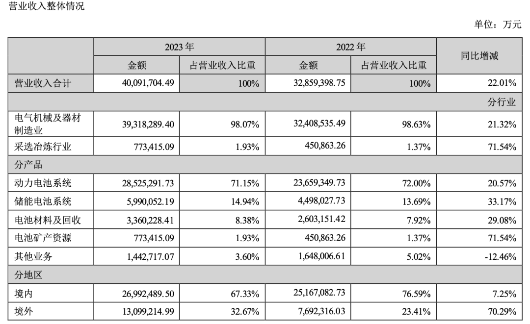 此外,电池材料及回收业务营收336.02亿元;增长最快的是电池矿产资源,该板块营收上涨超71%至77.34亿元,在公司总营收占比为1.93%;其他业务营收144.27亿元,同比减少12.46%。