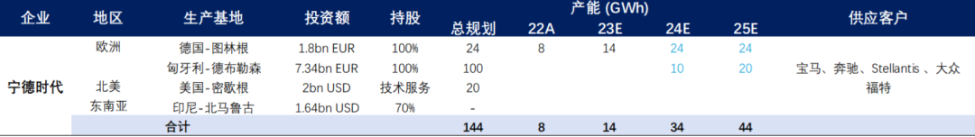 东兴证券调研报告显示,目前宁德时代已在欧洲规划两座生产基地,在北美地区和东南亚有投资或技术服务合作。