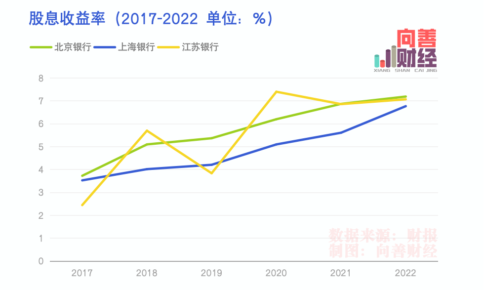 对比来看,同期上海银行的股息率分别为5.1%、5.6%、6.7%;江苏银行分别为7.4%、6.8%以及7.0%。