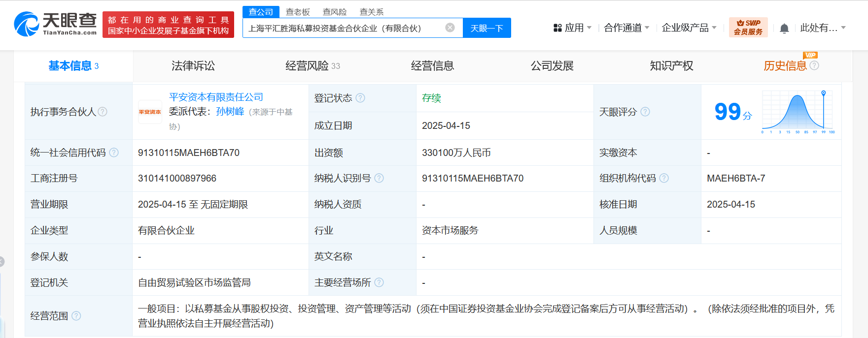 天眼查App显示,近日,上海平汇胜海私募投资基金合伙企业(有限合伙)成立,执行事务合伙人为平安资本有限责任公司,出资额33.01亿人民币,经营范围为以私募基金从事股权投资、投资管理、资产管理等活动。