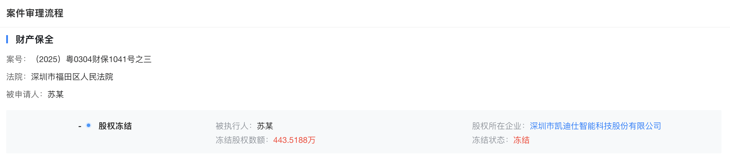 天眼查显示,苏祺云所持深圳凯迪仕2117.4819万元人民币股权、深圳领凯企业管理合伙企业(有限合伙)7.31万元人民币出资额,本月被深圳市福田区人民法院冻结。