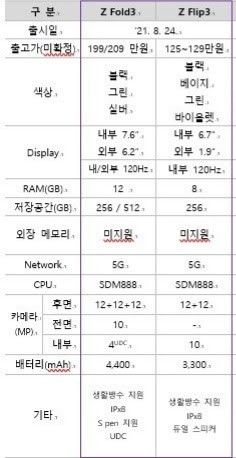其他方面,根据此前曝光的消息,两款折叠屏手机在折叠方案上有着截然不同的区别,其中全新的三星Galaxy Z Fold3将采用6.2英寸的外屏以及7.5英寸的可折叠内屏,而三星GalaxyZ Flip3将继续沿用前代的上下翻盖式设计,采用的是一块6.7英寸动态AMOLED屏幕,支持120Hz刷新率,依然采用居中打孔的设计。