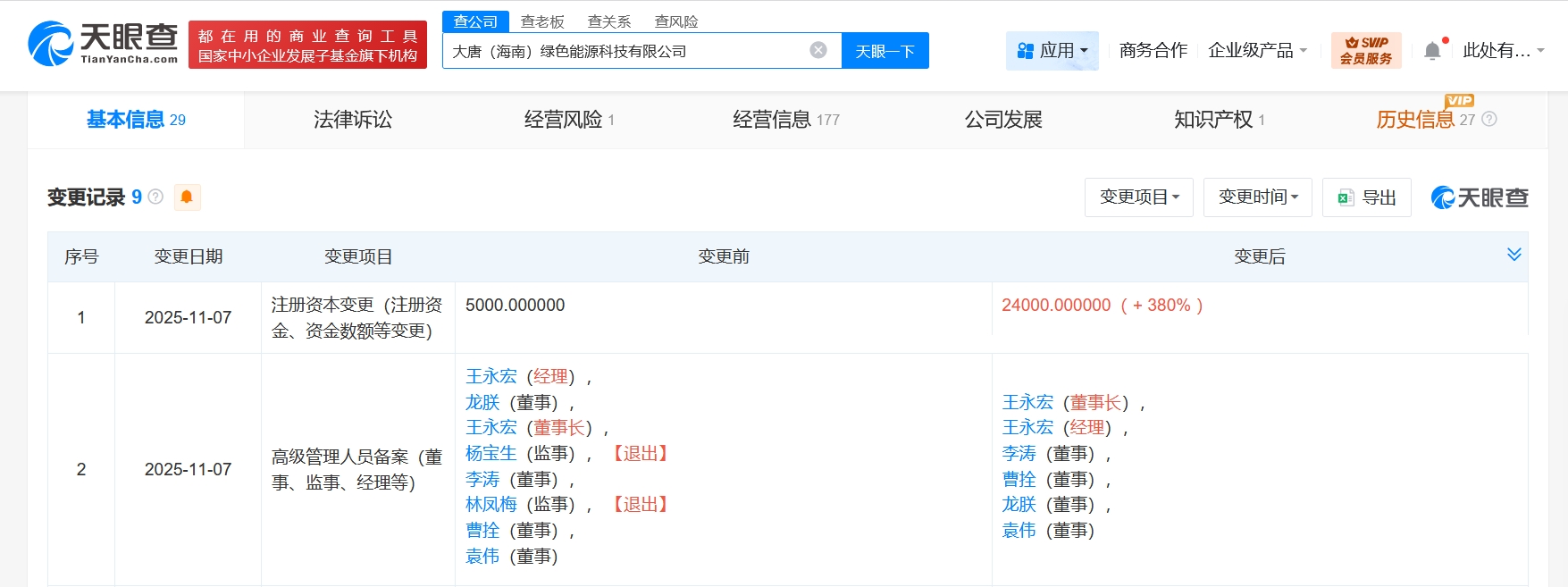 天眼查工商信息显示,近日,大唐(海南)绿色能源科技有限公司发生工商变更,注册资本由5000万人民币增至2.4亿人民币,增幅380%,同时,多位高管发生变更。