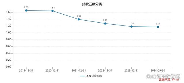 同期的不良贷款率总体呈现下滑态势,分别为1.65%、1.64%、1.39%、1.27%、1.18%,前三季度进一步下降至1.17%。