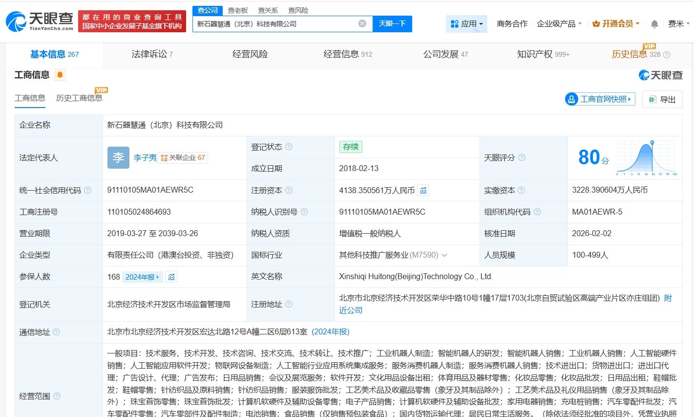 新石器慧通(北京)科技有限公司成立于2018年2月,法定代表人为李子夷,注册资本约4138万人民币,经营范围包括工业机器人制造、智能机器人的研发、智能机器人销售等。股东信息显示,该公司现由余恩源、理想汽车关联公司北京车和家信息技术有限公司及上述新增股东等共同持股。