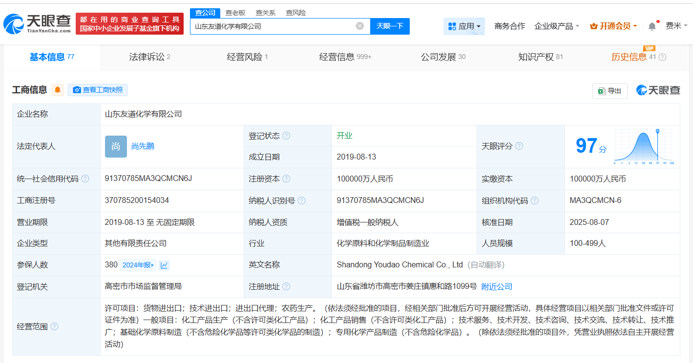 该公司成立于2019年8月,注册资本10亿人民币,经营范围包括化工产品生产、化工产品销售、基础化学原料制造等。股东信息显示,该公司由山东豪迈化学有限公司、山东泰益升化工有限公司共同持股。