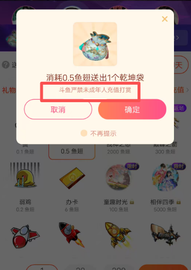 而斗鱼APP,用户在进行充值打赏时,页面上会提示“斗鱼严禁未成年人充值打赏”,不过凤凰网财经《公司研究院》发现,页面上的提示仅仅只是提示,用户可以直接点确认,然后通过微信支付宝等渠道进行充值。