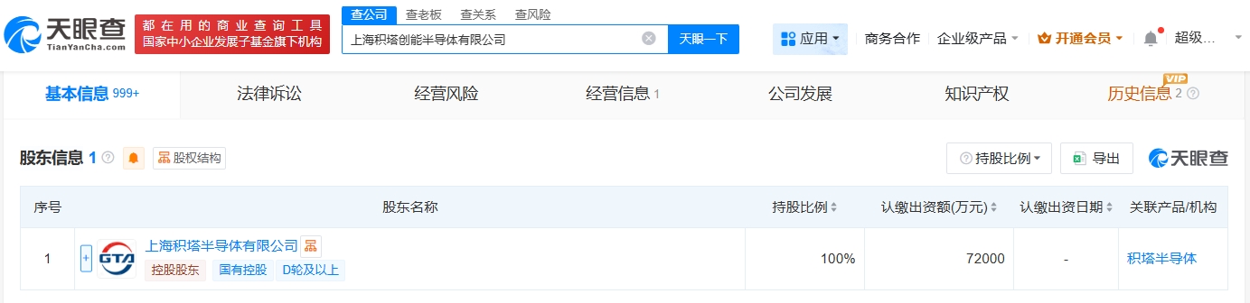 天眼查App显示,近日,上海积塔创能半导体有限公司成立,法定代表人为王辉,注册资本7.2亿人民币,经营范围包括半导体分立器件销售、电力电子元器件销售、电子元器件批发、电子元器件零售等,由上海积塔半导体有限公司全资持股。