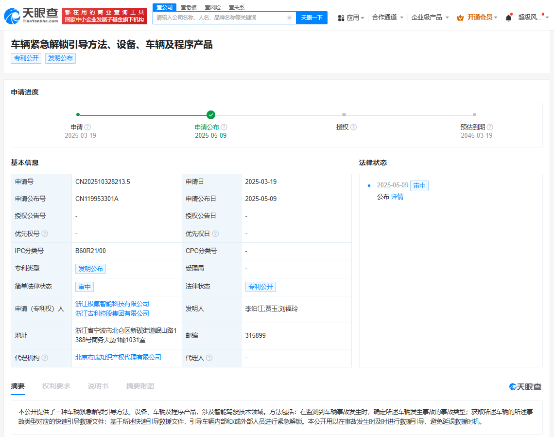 天眼查财产线索信息显示,5月9日,浙江吉利控股集团有限公司、浙江极氪智能科技有限公司申请的“车辆紧急解锁引导方法、设备、车辆及程序产品”专利公布。