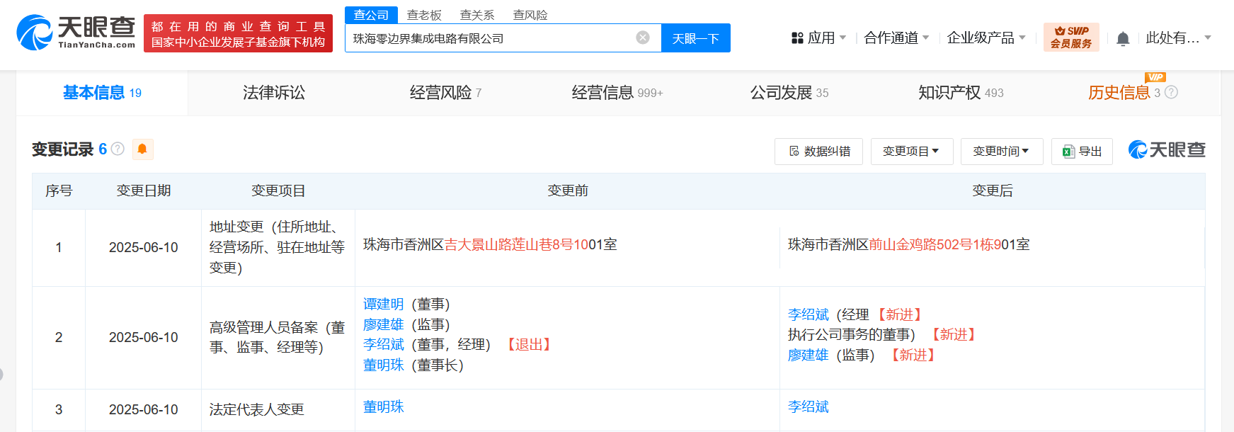近日,珠海零边界集成电路有限公司发生工商变更,董明珠卸任法定代表人、董事长,由李绍斌接任法定代表人,并由经理、董事变更为执行公司事务的董事、经理,谭建明退出董事行列。