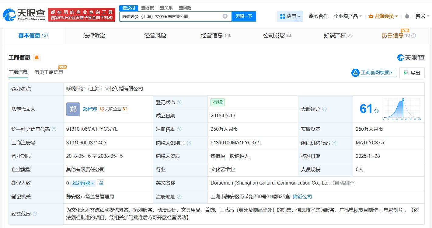 天眼查工商信息显示,近日,哆啦哔梦(上海)文化传播有限公司发生工商变更,陈睿卸任董事长,同时多位高管发生变更。