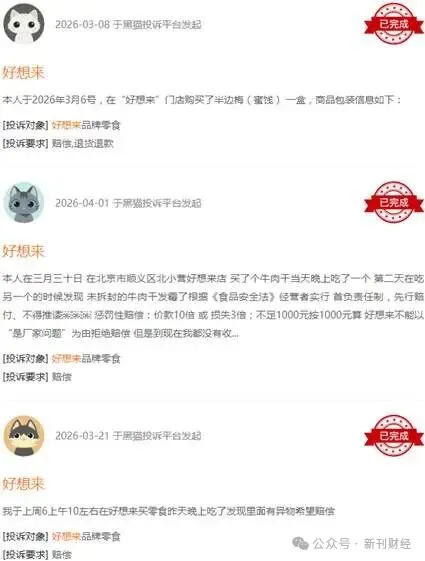 在黑猫平台上,涉及“好想来”关键词的相关投诉超过千条,包括对食品发霉变质和混入异物的投诉。