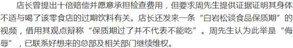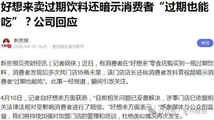 4月6日,消费者周先生在湖南郴州一家好想来门店购买了一瓶小洋人妙恋饮料,饮用过程中才发现该饮料已过期5天。交涉后,涉事店长承认“工作失误”并提出双倍赔偿,后又加码至十倍赔偿,并愿承担检查费用,但要求消费者自证身体不适与过期饮料有关。同时,店长还借用白岩松关于“食品过了保质期,并不代表不能吃”的视频,为门店销售过期食品的行为辩解。