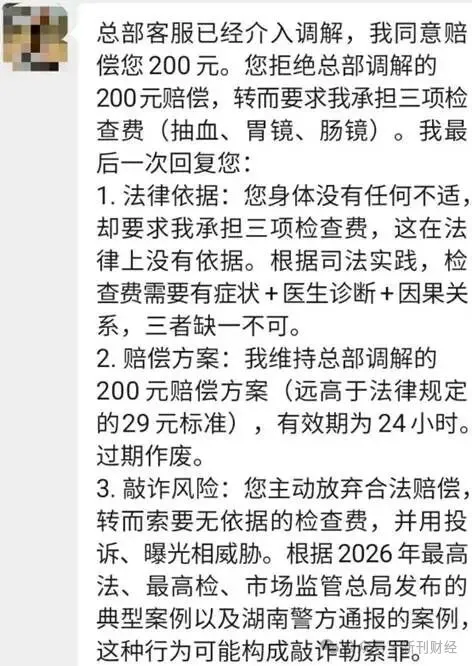 但消费者不仅认为自证要求不合理,而且觉得店长借用白岩松观点进行辩解的做法让其感到受辱,因此拒绝十倍赔偿方案,转而要求门店承担其抽血、肠镜、胃镜三项检查费用。