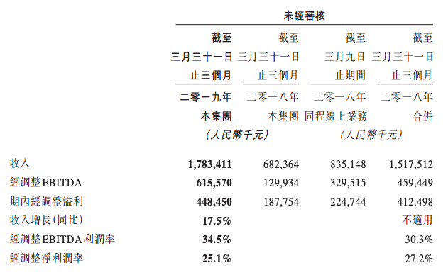 ‧ 收入由2018年同期的人民币 15.175亿元同比增加17.5%至人民币17.834亿元,‧ 平均月活跃用户由2018年同期的1.634亿人同比增加22.0%至1.993亿 人,‧ 经调整EBITDA由2018年同期的人民币4.594亿万元同比增加34.0%至人民币6.156亿元。