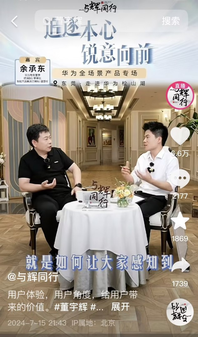 【TechWeb】7月16日消息,昨日晚间“与辉同行”走进华为东莞松山湖园区,与辉同行主播董宇辉与华为常务董事、终端业务董事长、智能汽车解决方案BU董事长余承东进行了一场直播对话。