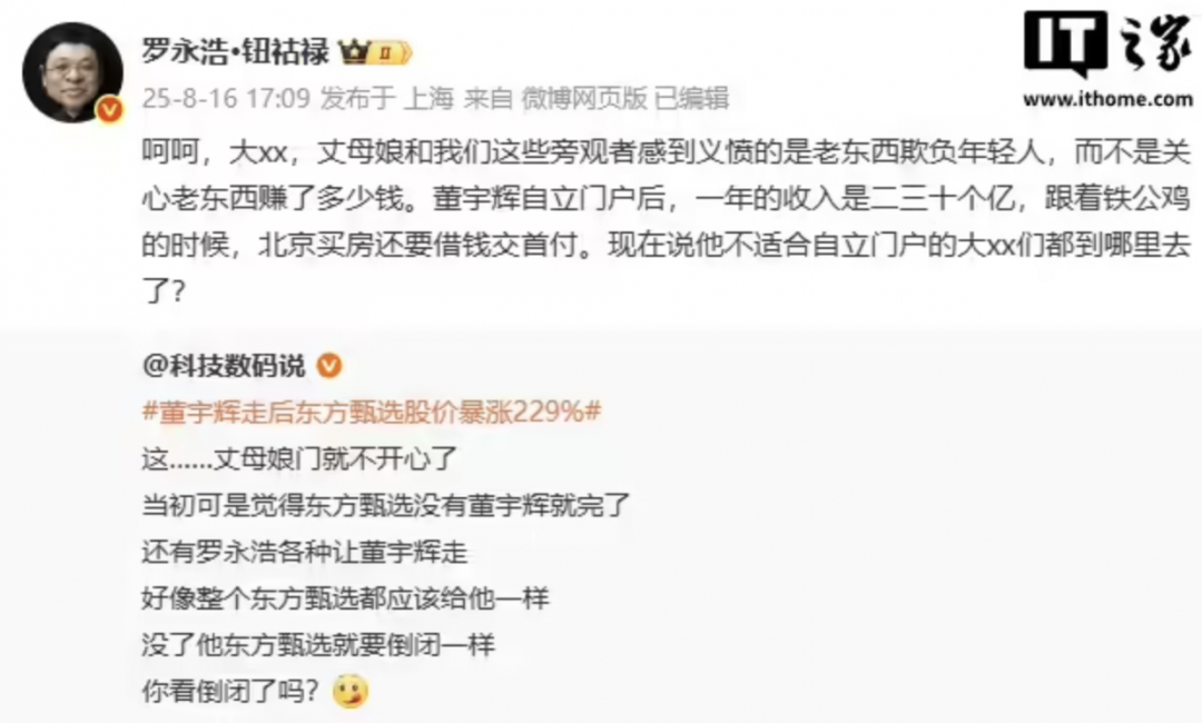 IT之家 8 月 17 日消息,8 月 16 日,罗永浩在微博发文,称董宇辉自立门户创业与辉同行之后,年收入二三十亿元,离职东方甄选之前还需要借钱交首付。对此,与辉同行方面对第一财经记者表示,该信息不属实。