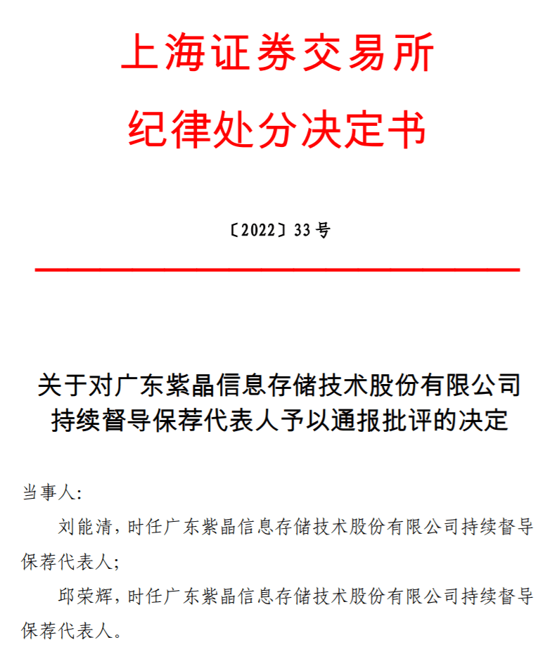 今年4月,刘能清与邱荣辉因紫晶存储被上交所监管警示与批评,二人收到“罚单”时,则将责任推给紫晶存储董事长郑穆。