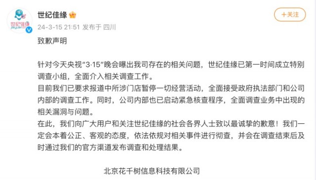 被315晚会点名后,世纪佳缘发布致歉声明,称已第一时间成立特别调查小组,全面介入相关调查工作。“目前我们已要求报道中所涉门店暂停一切经营活动,全面接受政府执法部门和公司内部的调查工作。同时,公司内部也已启动紧急核查程序,全面调查业务中出现的相关漏洞与问题。”