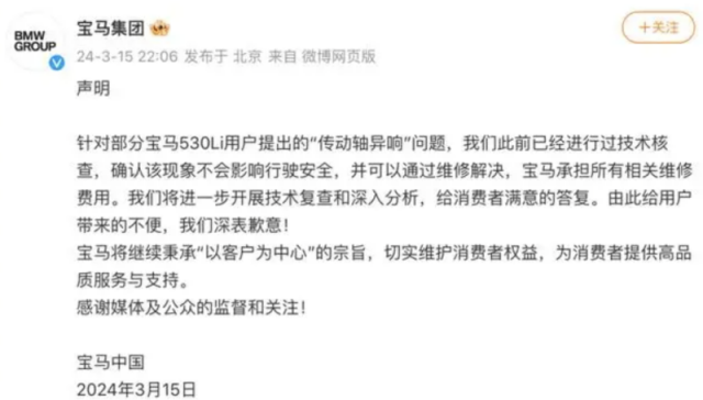 据央视财经报道,尽管传动轴频繁出现异响、车主投诉不断,但宝马厂家和各地的4S店并没有缩减汽车销售数量,出问题的车型依旧在大力推广销售中。