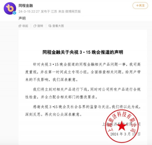 针对央视315晚会的报道,同程金融发布声明回应称,“我司高度重视,并在第一时间成立专项小组,全面排查相关问题。”“我们将立刻对相关产品进行下线,同时对公司所有产品进行合规性检查,并全力配合相关部门的整改要求。”