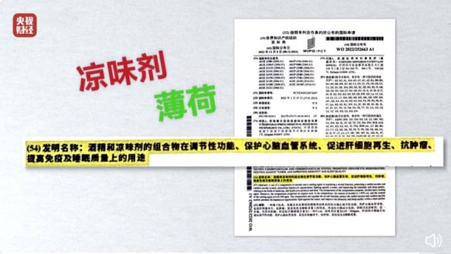 听花酒的一名工作人员称,听花酒的健康性是有国际专利的。但世界知识产权组织国际局官网上,听花酒提交的《酒精和凉味剂的组合物在调节性功能、保护心脑血管系统、促进肝细胞再生、抗肿瘤、提高免疫及睡眠质量上的用途》在国家处理状态一栏显示空白,负责这份专利代理人解释:谁都可以申请公布自己的所谓发明专利,但能不能被认定为专利,则是另一回事。此外,他告诉315晚会记者,听花酒的专利里提到的凉味剂,并不是什么高科技物质,就是我们常见的薄荷提取物。