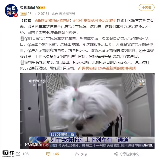 IT之家 11 月 2 日消息,据央视新闻报道,铁路12306 App的官方购票页面目前已上线“宠物托运”功能,用户可以直观发现部分列车车次信息旁已有“宠”字标识,这代表相应车次可办理宠物托运业务,目前全国有 40 座高铁站可办理。