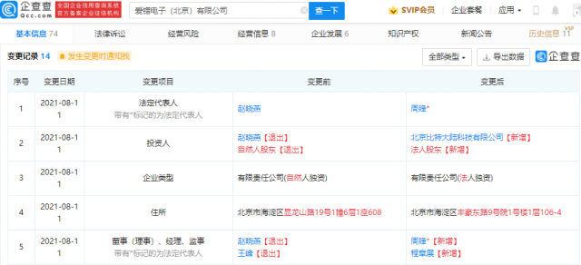 【TechWeb】企查查APP显示,8月11日,爱镨电子(北京)有限公司发生工商变更,原股东均退出,新增股东北京比特大陆科技有限公司,持股100%。