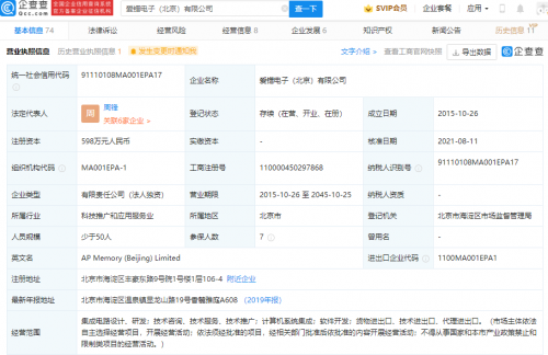 企查查信息显示,爱镨电子(北京)有限公司为集成电路设计公司提供高端模拟IP定制设计服务,成立于2015年,法定代表人为周锋,注册资本598万元人民币,经营范围包含:集成电路设计、研发;技术咨询、技术服务、技术推广;计算机系统集成等。