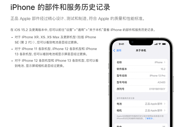 比如能查看iPhone维修零部件是否是正品,另外iPhone 12和iPhone 13系列还支持查看摄像头是否更换,帮助用户查看更换的零部件是否是正品。