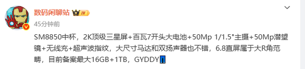其他方面,根据该博主透露,该机还将采用大R角设计,配备超声波屏下指纹识别,解锁速度与安全性更优。硬件上,该机除了将搭载骁龙8 Elite Gen5旗舰平台外,最高将支持16GB运行内存与1TB机身存储的组合,满足重度用户与游戏玩家的需求。还将内置容量超过7000mAh的超大电池,并支持百瓦级有线快充技术,兼顾长续航与极速回血。此外,该机将配备大尺寸X轴线性马达,提供出色的触觉反馈,同时保留双扬声器设计,增强影音与游戏体验。