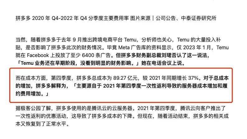 结果大家惊讶地发现,从拼多多年末的财报中,营销费用竟然同比减少了 30% ,也就是大概 30 亿的样子。而拼多多解释道:这是腾讯云给我的云服务打折了。